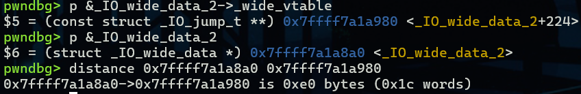 _wide_data不仅要将其设置为可控堆地址,还要满足_wide_data->_wide_vtable是我们已经布置到的0xD0,那么我们设置成fake_io_addr + 0xD0 - 0xE0,0xE0是固定偏移