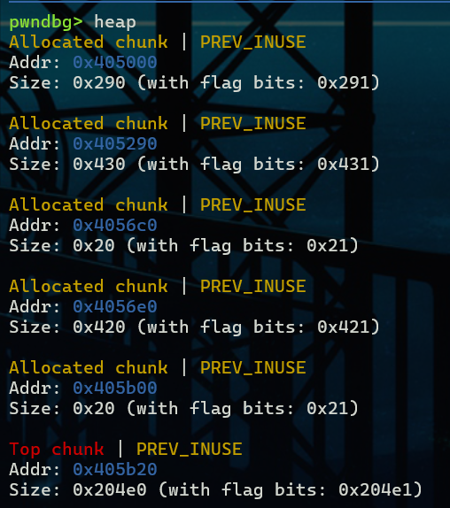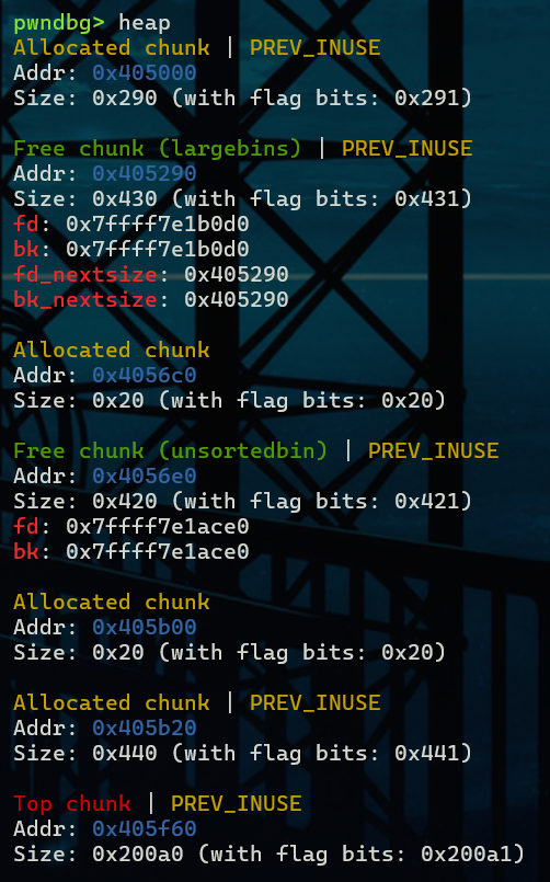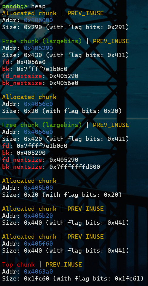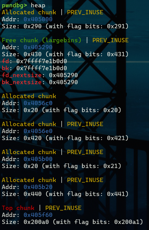 在利用前需要明确一点,largebin大大小在0x400以上,同时要注意top chunk合并的问题。