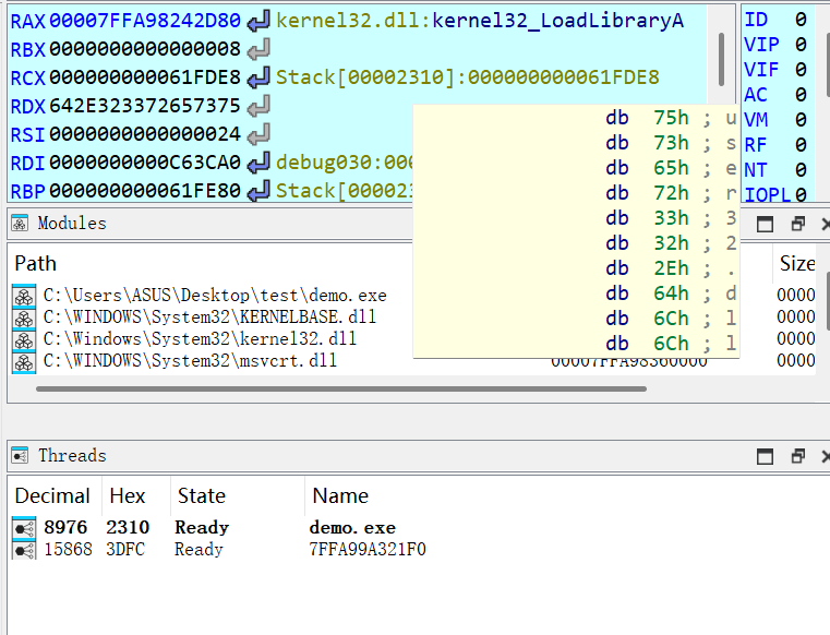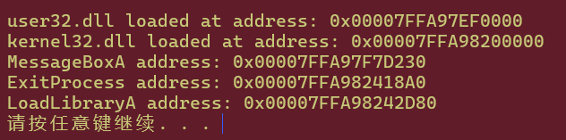 我们的目标是调用MessageBoxA()函数,而这个函数在user32.dll中,不一定每个程序都会加载这个库,那我们就需要首先调用LoadLibraryA("user32.dll")来加载这个库,并获取到user32.dll的基地址,然后就能根据偏移找到MessageBoxA()函数的地址了