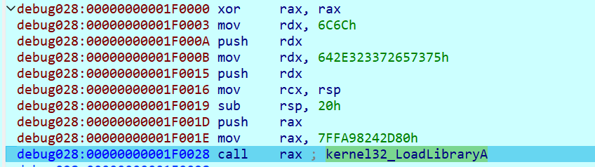 ; LoadLibraryA("user32.dll")      // ensure the user32.dll is loaded